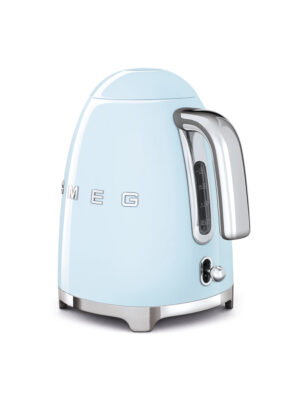 KLF03BLEURetro elkedel fra Smeg som kan indeholde 1,7 liter og har tørkogningssikring samt autosluk ved 100ºC.