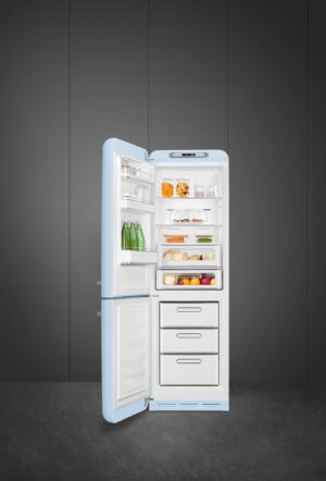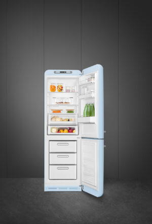 FAB32LPB5Kombineret køle-/fryseskab fra Smeg i pastelblå med 3 fryseskuffer, No Frost og Multi Flow kølesystem.