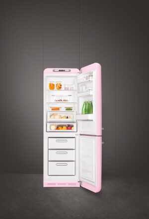 FAB32LPK5Kombineret køle-/fryseskab fra Smeg i lyserød med 3 fryseskuffer, No Frost og Multi Flow kølesystem.