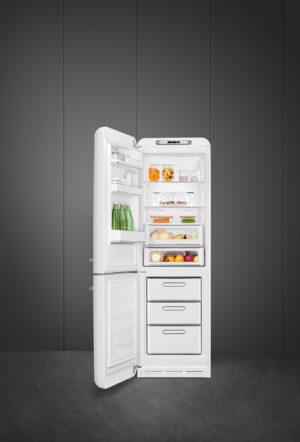 FAB32RWH5Køleskab fra Smeg i hvid med separat fryserum, grøntsagsskuffe og LED belysning.