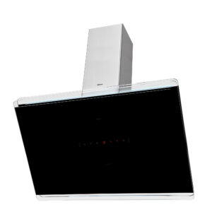 EFS 8690-92Vægmonteret emhætte i rustfri stål og sort glas med tre LED spots samt timerfunktion.
