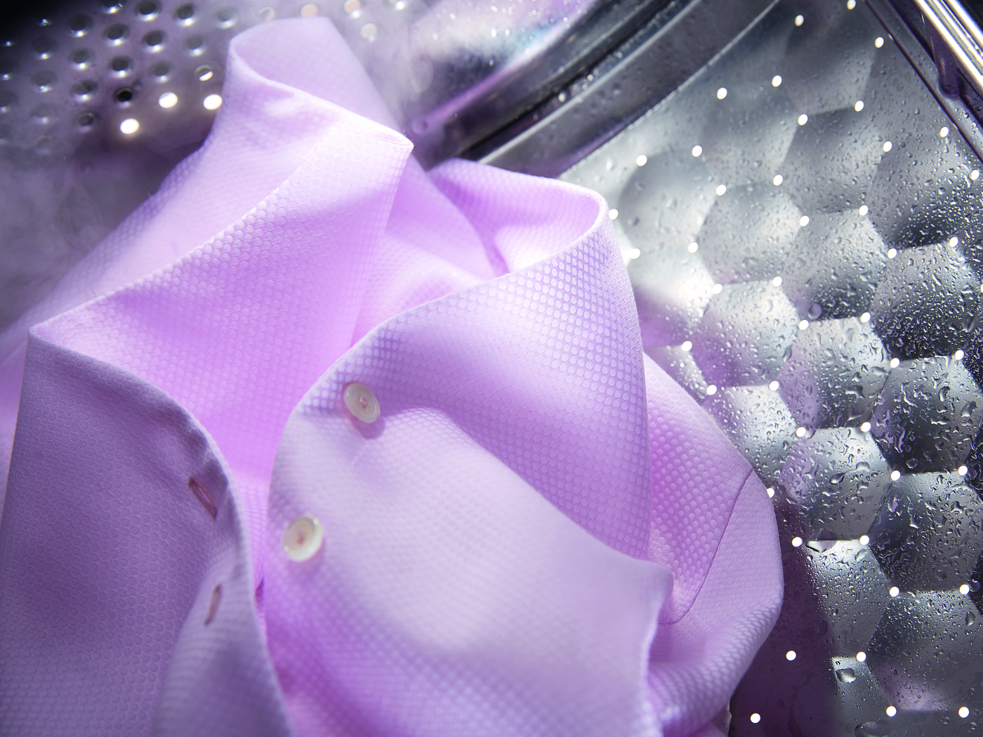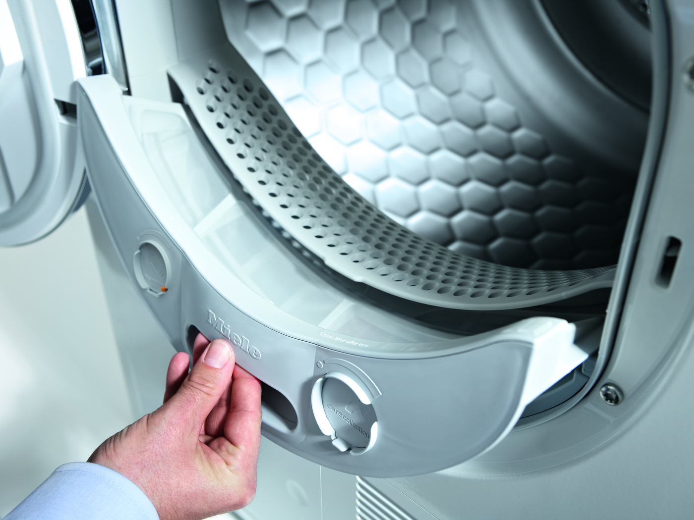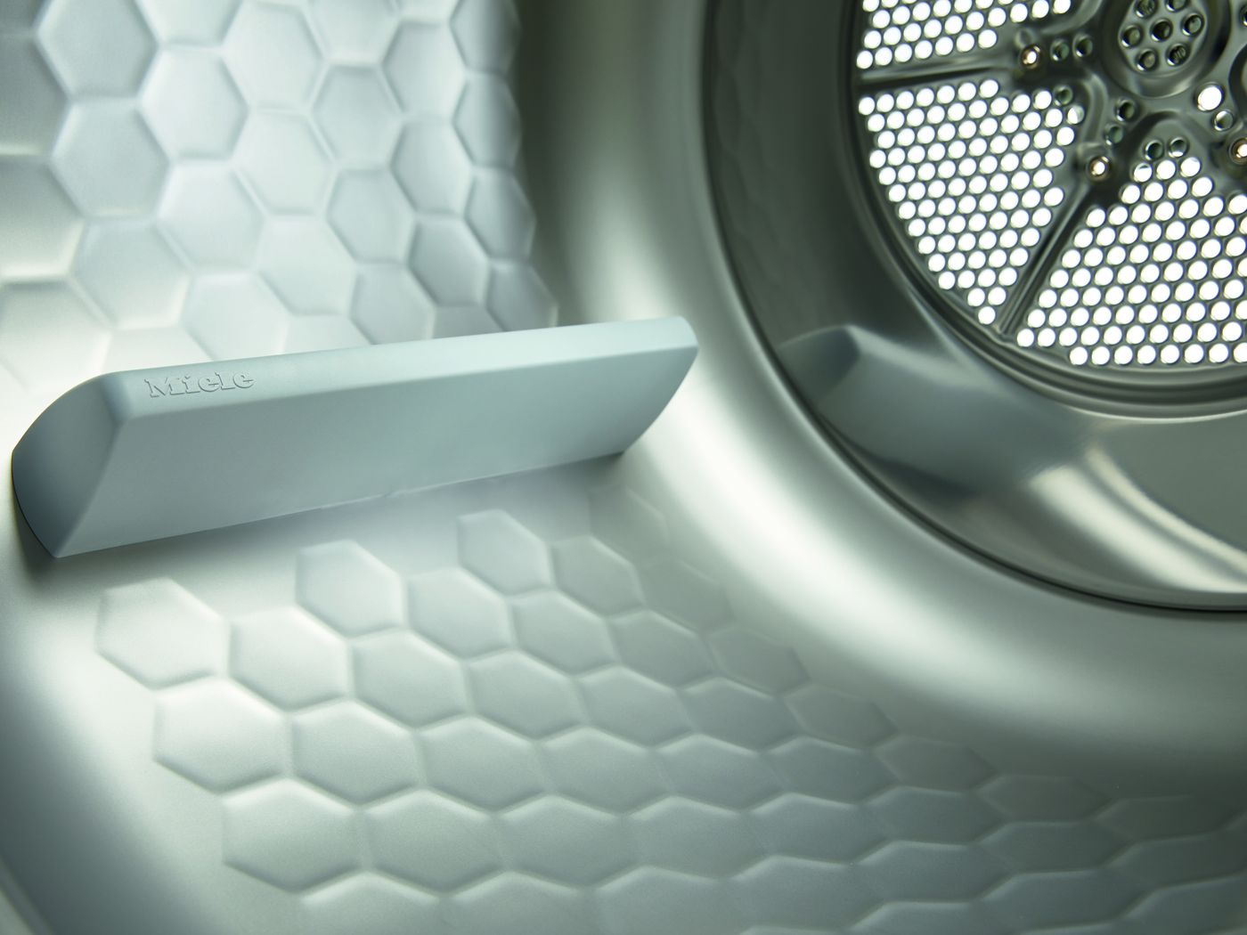 Med overfladestrukturen på Mieles SoftCare-tromle dannes en fin vandfilm mellem tekstilerne og tromlevæggen. Vasketøjet glider let på denne film og skånes herved optimalt. Gennem de små åbninger med poleret kant opstår der ingen nopper eller trådudtræk i dit vasketøj. Fremmedlegemer såsom papirclips eller BH-bøjler ender ikke længere i afløbspumpen.