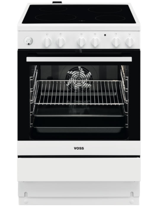 Hvidt glaskeramisk komfur med 4 kogezoner. Komfuret har katalytisk selvrens og et ekstra stort ovnrum. Læs hele beskrivelsen